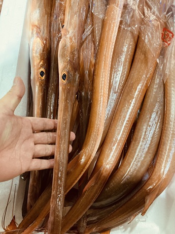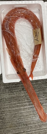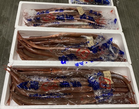 長崎魚市では赤ヤガラが入荷しています。1尾のサイズは1kg前後が主体で大きいもので体長2m、重量4kgを超えるものもございます。